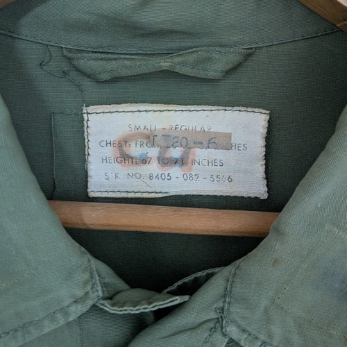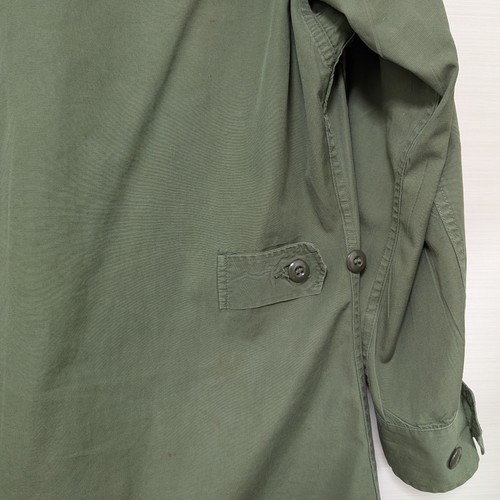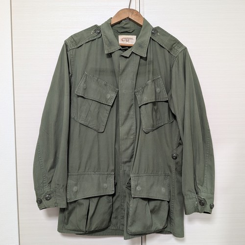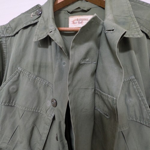 60年代 US製 ジャングルファティーグ ジャケット サイズ 着丈77.5cm、身幅56cm、肩幅46cm、袖丈(肩から)57cm エポレット 腰アジャスター付きの2ndタイプ 細かな汚れダメージあり。COTTON 100%