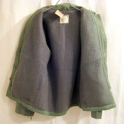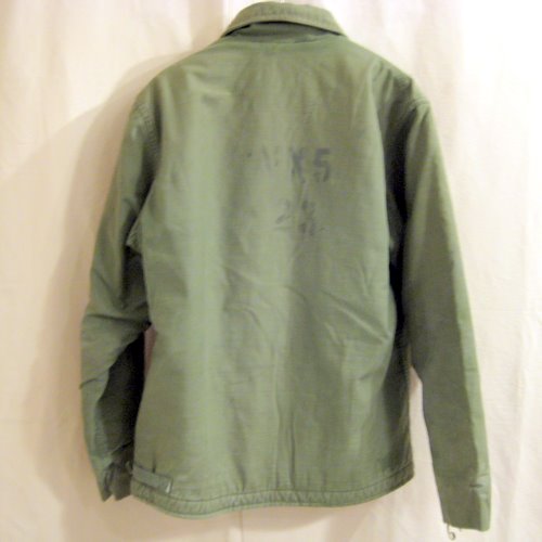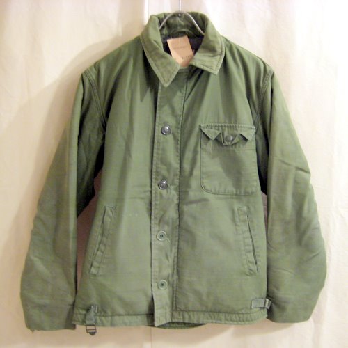 70年代 A-2デッキジャケット サイズ 着丈69cm、着幅51cm、肩幅47cm、袖丈60cm 下二つのボタンが付け替えられています。右側のアジャスターが欠損しております。インナーはアクリルブランケットです。 バックにステンシルがあります。ジップはSCOVILです。