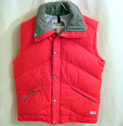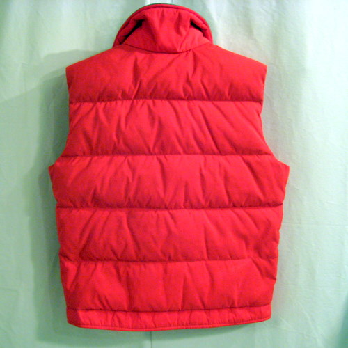 70年代 ノースフェイスダウンベスト サイズ 着丈61cm、着幅54cm、肩幅44cm 襟はコーデュロイ、ジップはTALONです。所々にうっすらと黒いシミが見えます。レッド