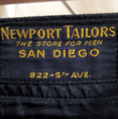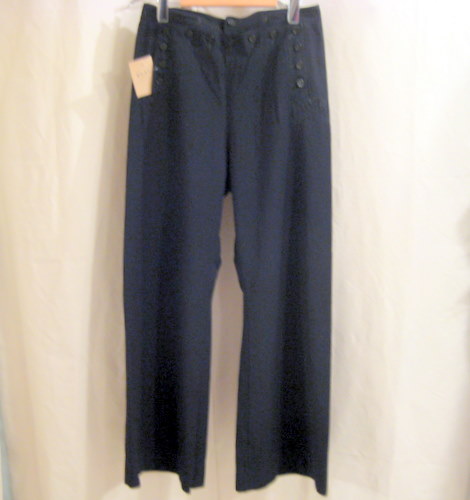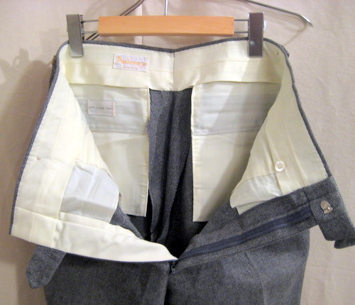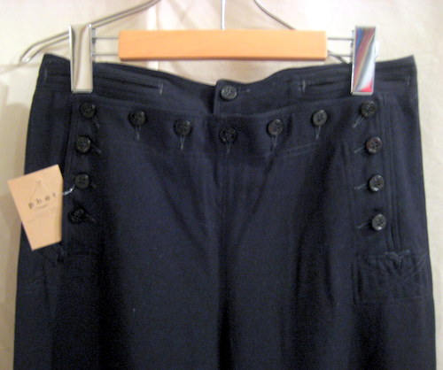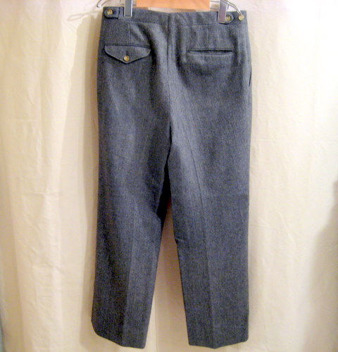 年代不明 ギャバディンパンツ サイズ ウエスト82cm、股下77cm、股上26cm 詳細はわかりませんがサンディエゴの仕立て屋によるパンツです。ボタンには全て錨マークがあります。フロント内側のボタンが一つ欠損しておりますが、通常履いている際には見えませんので特に気になる箇所ではありません。ベルトループはありません。フレアタイプ ブラック