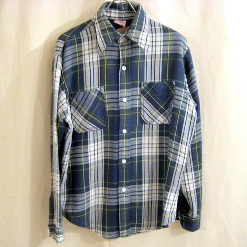 70年代 BIG MACフランネルシャツ サイズ 着丈69cm、着幅55cm、肩幅45cm、袖丈57cm 65%コットン、35%ポリエステル 写真の様にバックにうっすらと白い塗料でペイントがあります。袖口に糸のほつれがありますが穴は開いてはいません。グリーン×ホワイト×イエロー