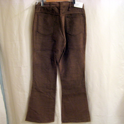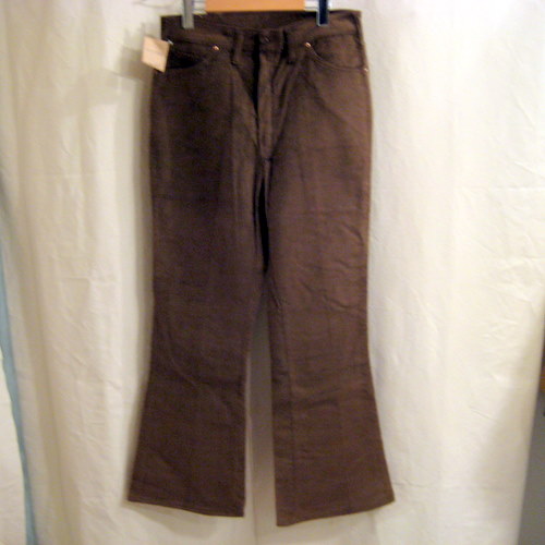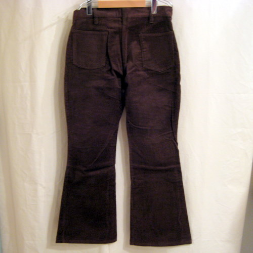 70年代 デッドストックEXPRESSIONS by CAMPUSブラッシュコーデュロイフレアパンツ サイズ ウエスト88cm、股下77cm、股下24cm コーデュロイが起毛したような感じです。スナップボタンタイプ、ジップはTALON42です。ブラウン