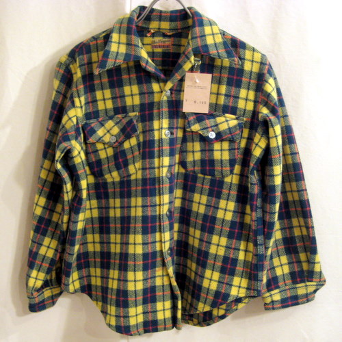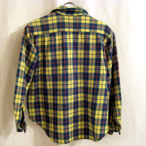 60年代 ウールフランネルシャツ サイズ 着丈61cm、着幅52cm、肩幅41cm、袖丈50cm トップボタンはループホール シェルボタン イエロー×グリーン×レッド