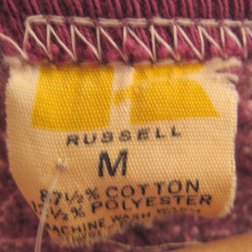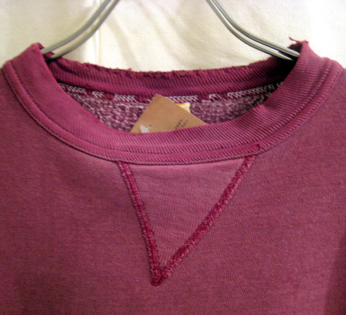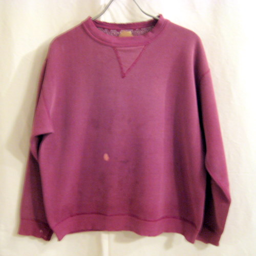 60~70年代 ラッセル前Vスエット サイズ 着丈54cm、着幅53cm、肩幅48cm、袖丈48cm コットン87.5%、ポリエステル12.5% 縫製はトリプルステッチで、袖はセットインスリーブです。全体的にダメージが多く、フロントや右腕リブ付近にヤケがありますので、雰囲気重視の方にお勧めです。パープル