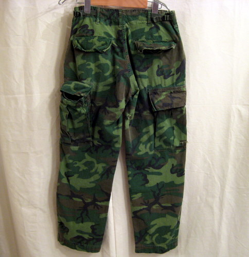 68年 グリーンリーフカモフラミリタリーパンツ サイズ ウエスト76cm(アジャスターがサイドについているので多少の調節はできます。)、股下70cm、股上22cm ベトナム戦争時のアメリカ軍の6ポケパンツです。ジップはRAPIDです。バックにダメージがあります。