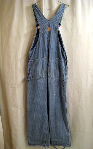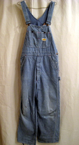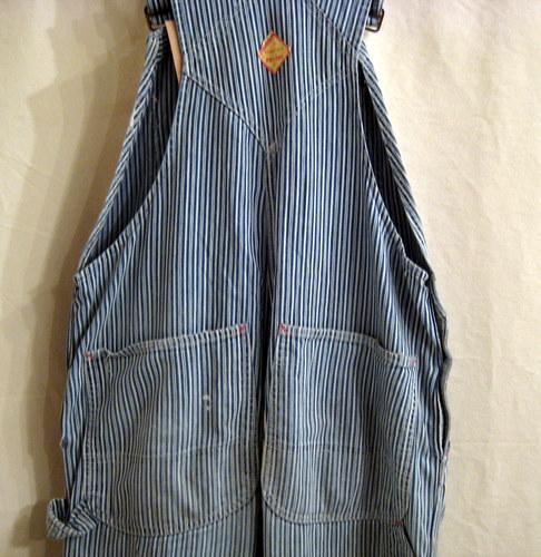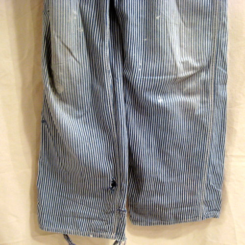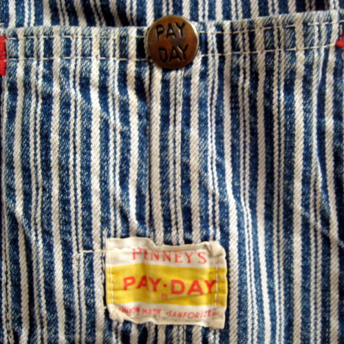 60年代 PAY・DAY ヒッコリーストライプのオーバーオール サイズ ウエスト88cm、股下72cm、総丈(ストラップも含めて)153cm ボタンは刻印入りです。ペンキはね、ダメージがあります。