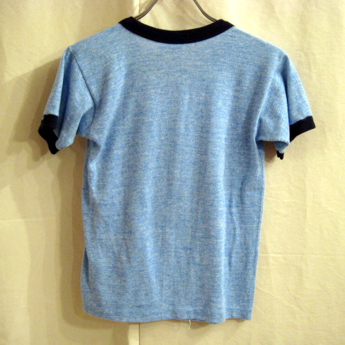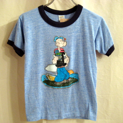 79年 スポーツウエアー社のポパイアイロンプリントT サイズ 着丈50cm、着幅37cm、肩幅35cm 霜降りブルー×ネイビーリンガー