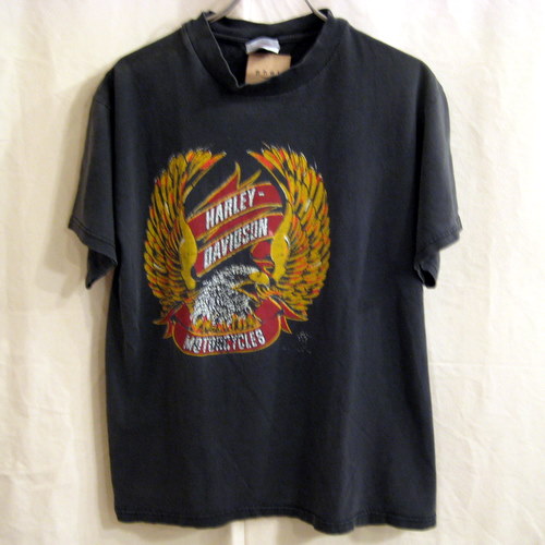 HARLEY-DAVIDSON Tシャツ サイズ着丈59cm、着幅47cm、肩幅43cm 脇部分に穴をふさいだようなリペアがあります。生地を被って縫ってしまっているので一度ほどいてかいいから当て布などでリペアをしたほうが良いかもしれません。