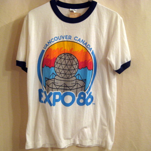 86年 カナダのバンクーバで行われたEXPOのオフィシャルスーベニアTシャツ サイズ 着丈61cm、着幅47cm、肩幅41cm ホワイト×ネイビー 染み込みプリント